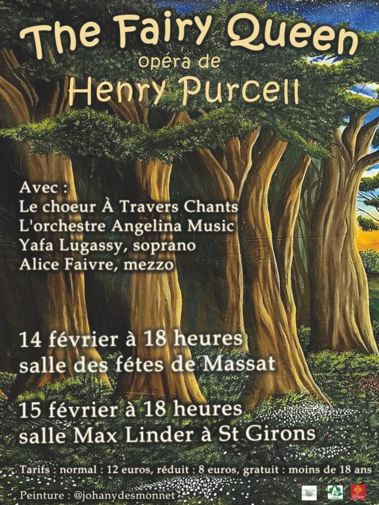 La chorale “A Travers Chants” avec ses 25 chanteuses et chanteurs du Couserans vous invite à un week-end de la Saint-Valentin bien spécial: entourée de l'orchestre Angelina Music et de deux solistes, elle joue l'Opéra “The Fairy Queen”, composé par Henry Purcell en 1692. Le livret est une adaptation de la célèbre piece “Le Songe d'une Nuit d'Été de William Shakespeare, une intrige amoureuse qui embarque le public dans une forêt féerique où magie et amour se mêlent. Vous retrouverez l'atmosphère baroque exubérante et joyeuse avec musique, chants, danses, costumes et décors pour créer une ambiance féerique et bucolique.